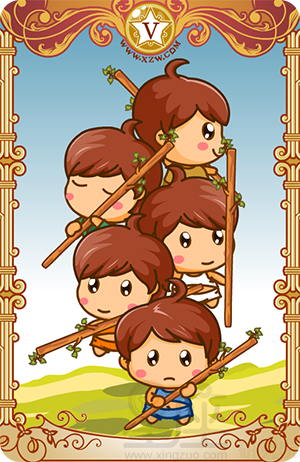 这张权杖五代表冲突。虽然冲突不至于伤害任何人,但却是所有人全盘卷入。只是权杖类型的天性,总是把生活看成战争,因为如果没有障碍,就没有冒险了。