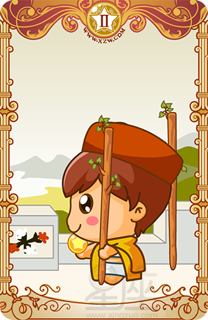 在权杖二上,一支权杖是拴在墙上,而另外一只是自由的。这表示你有两个选择,一部分的你满意静止状态,而另一部分的你有移动、改变或旅行的欲望。而权杖二里的人是烦闷的,被他的成就(矮墙)所围绕。他手中的地球仪表示他正在做一决定。他的世界(指他的成就或环境)对他而言,似乎不再具有意义了,因为他已经长大而不适宜于此了。土地表示稳定力,水表示宁静。他越过水,眺望远山及其代表的挑战,天空乌云密布,但他并没有注意到,因为他将焦点置于内心世界。