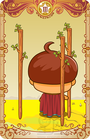 倒立的权杖三表示需要沉思的一段时间。切记每当翻到倒立的牌时,你必须回到前一个号码的正立牌去研究其中的课题。例如,当权杖三是倒立时,你必须回到权杖二的课题上,去思考你的选择。