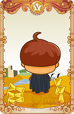 圣杯五画一名黑色外衣的人,这象征着悲伤。他的头下垂,这是人在厘清感情时的一种自然姿态。前面躺着三个翻倒的杯子,象征失去或浪费机会。不管怎样,生命的河流继续留着。