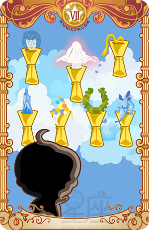 圣杯七是一张代表自我发现、心灵成长以及认识内在需求的牌。提醒你,充分了解自己与自己的行动,你需要行动,也需要思考。对行动有所思考能帮助你将直接的经验转变为知识,并更向智慧与理解靠近。