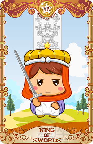 宝剑国王代表空气元素中土的部分。他象征实用的思考和构想。这张牌是在告诉你,你需要利用你的构想去做一些真实的事,并拥有一些物质的东西来代表它们。