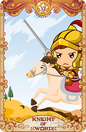 宝剑骑士代表的是迅速的行动:跃进或跳出某种情景。作为某个问题的答案,它暗示着一个快速的动作或出其不意的行为是有需要的。已经没有时间去想该做何选择了——去做就对了。