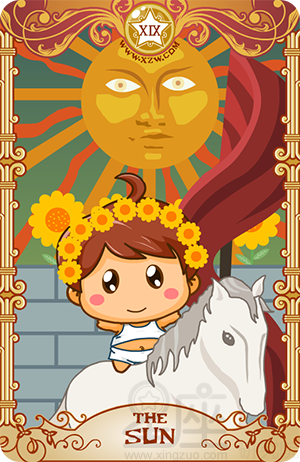 这张牌代表在太阳底下,所有事情都是明晰、乐观及欢乐的一段时间。现在所有事物都清晰可见,也没有在月亮中所经历的恐惧行迹。太阳意味对人生深入的理解,但又能够从浅显简单的事物中获得满足。它显示一种活跃、有创造性、精力充沛的状态,小孩子们能够自然体验到的一种状态。