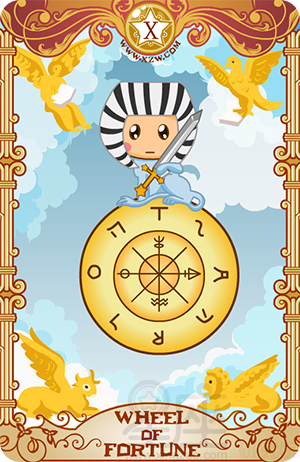 这张牌中所画的生命之轮持续在转动中,事情可能变好,也可能变坏。这张牌角落处的四种图案代表生命的四种元素,或四种对待生命的方法——老鹰代表水;长翅膀的狮子代表火;长翅膀的公牛代表土;天使代表空气。它们是黄道带上面四种固定的象征符号,分别为天蝎座(老鹰)、狮子座(狮子)、金牛座(公牛)、水瓶座(天使)。它们各持一本书,代表它们从各自的观点在学习有关人生的事情。