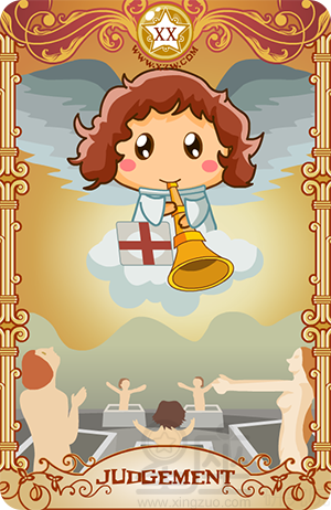 审判牌意指你对人生的老旧观念已经死亡,你正在接受内心的召唤,去过一种更有意义的生活。换句话说,你内在的自我敦促你别忘记,你是一种学习成为人类精神性的生命。你应该超脱你对生命的局限想法,看清生命的本质,你是一种学习成为人类精神性的生命。你应该超脱你对生命的局限想法,看清生命的本质。要完成个人工作,你可以再次,也是最后一次潜入你的无意识水池或精神之中,然后带着一种没有受到污染、纯洁的理解回来。你已经抛弃自我,也已经知道万物是如何有相同的能量、相同的生命力中萌芽的,我们彼此间只是外表和生活态度不同罢了。
