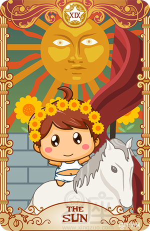 这是大阿卡纳中最好的一张牌,它象征知识与活力。牌面中一个小孩骑着一匹马在歌颂着太阳带来的生命力,接受着太阳赋予他的能量。太阳的力量如此强大,它给世间万物以生命,它的光 芒如此温暖,所有的生命都为之感动。它的力量完全是正面的,充满希望和理想,任何黑暗都抵挡不住它的光芒。