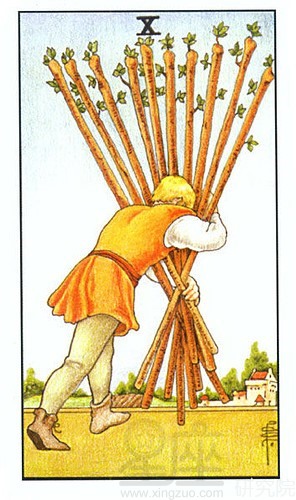 权杖十所描述的牌面是打仗完收工的场面,图中的人物收拾起武器,将各个权杖搬运回城堡,以备下次作战所需。而战争的伤亡严重,所以一个人必须承担起负重的任物,图中可以看到人物将头埋于所有的权杖之中,独自面对承担这项任务,而城堡似乎还很远,离达阵还有一段距离,所以这样的状况,他举步维艰,每一步都走的不容易,身负巨大压力。
