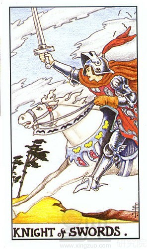骑士将宝剑高举过头,超出整个牌面,透露出未达目标,不之付出代价、卯足全力,往前冲的方向。宝剑骑士想到甚么就会马上去做。在思想上较急躁、容易慌张、没有耐心,常没有经过衡量与评估,便急着下决定与行动。马匹奔腾跳跃,看起来有些慌张表示在往前冲同时,内心是混乱,根本不知道自己要飞到哪里。