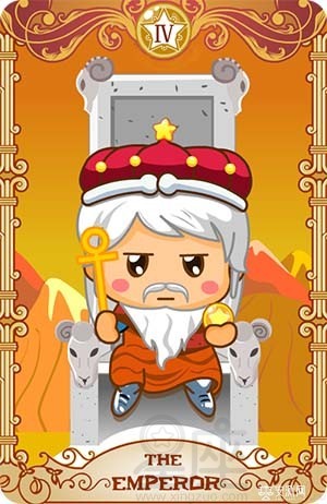 这皇帝坐在一张石椅上,左手握着一颗宝球形物体,而右手则握着一根宝杖。宝杖顶端是一个圆圈,它是肉体死亡之后,灵魂生命的象征。他在衣服底下还穿着铁甲,因为他总是处于备战状态。座位顶端和手底下的公羊头说明了这张牌代表占星学上的牧羊座。