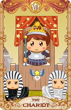 这张牌描绘的是克服障碍、获得胜利的王者战车。牌面上的胜利者以一种强有力的姿态站在战车上,展现他在人世间的丰功伟业。拉动战车的一黑一白两只狮子,时刻准备继续前进。