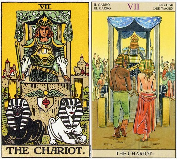 一名武士站在战车上,右手拿着一根绳子或权杖,肩膀上则有两枚蓝色的月亮。战车的蓬盖上缀满了星星,而腰带上则展示着黄道十二宫的各种符号。战车部分停在水中,部分停在陆地。武士的前方有两尊狮身人面兽,一黑一白,正好与女教皇牌上的柱子相呼应。