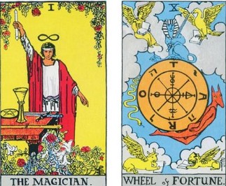 “魔术师”的占星属性是水星。在我们的塔罗讨论范围中,水星的贡献是圆滑的,狡猾的,无常的,善变的,灵巧,骗局,虚假,伪造,骗子,有意思的谎言,能言善道,意味深长的,有口才的,沟通能力强的,有魅力和吸引力的特质。所以,“魔术师”也拥有着水星所带来的正面与负面的潜能。另一方面,“命运之轮”的占星属性是木星。而木星所赋予此牌的特性包括广阔的,健谈的,扩张的,豪爽的,膨胀的,幸运的,带来好运的,积极的,有信心的,确信的能量。