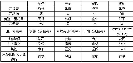 现代塔罗历史学家RonaldDeck指出,在十七到十八世纪,法国四牌组的符号与意大利四牌组的符号是共通的——心相当于杯、矛头相当于剑、棒相当于币、钻相当于杖,所以,很显然,法国四牌组的对应模式是基于早先意大利四牌组的对应模式,即杯对应欢乐与神职阶级、剑对应悲伤与贵族阶级、币对应金钱与商人阶级、杖对应纯朴与工农阶级。所以在中世纪及文艺复兴时期,为四牌组与四大阶级、四元素、以及其他四重系统建立起对应思想是很普遍的。因而,可以认为完整的塔罗小牌四牌组反应的是历史上存在的各个四重体系(见下表):