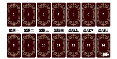 牌型总共有十四张牌,同一列的两张代表同一天会出现的运势状况。也就是说,1和8代表同一天的运势,2和9代表另一天的运势,依此类推。七组牌便构成了未来一周的运势。