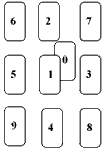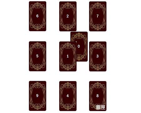 接着继续请求问者抽出九张牌。依照图示位置,将选出的牌按顺序放在“1”到“9”的位置。然而,这九张牌都不能先翻开。“1”位置的牌要盖过刚刚先掀开在“0”的位置的第一张牌。
